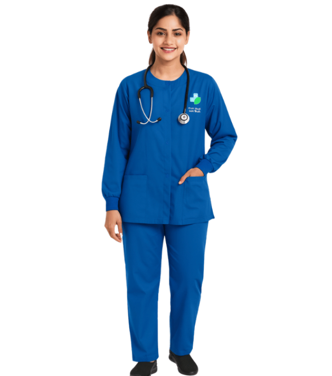 - Women's Round-shaped neck design scrub top with an elastic cuff on sleeves and two patch pockets to give ample space to store your medical items.